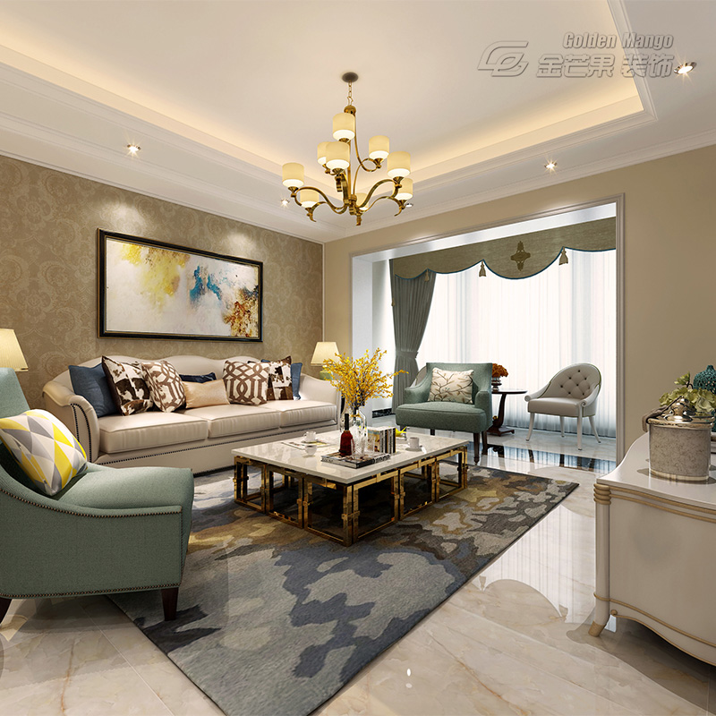 高亮的金屬透著奢華的氣息,電視背景墻顯得高貴無比,搭配上清新淡雅抹茶綠的沙發(fā),落地窗和白色的窗簾,這都是歐式風(fēng)格的體現(xiàn),以深色的窗簾做遮光,厚實、沉穩(wěn)。整體上顯得溫馨十足。