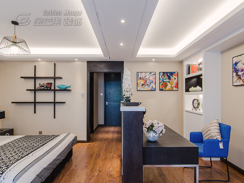 個人空間感強烈。色調舒適,布置了工作和學習的區域,梨木色的木質地板,墻上藝術掛畫,微弱的燈光渲染著休息的氛圍。