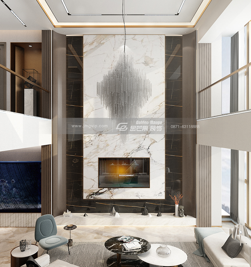 寬闊而不空曠的客廳空間,挑高的電視背景墻設計,隨性又自由。石材和金色鐵藝結合的茶幾,輕松打造奢華高級感。非常具有設計感的客廳大吊燈,如夢似幻,優雅大氣。