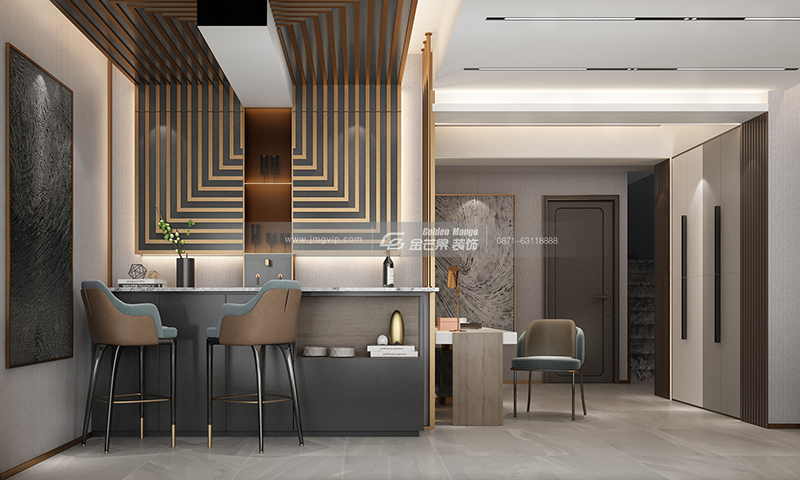 金屬質地的吧臺椅呼應整體空間,墻上的寫意裝飾畫簡而不減,奢而不膩。個性的酒柜設計,讓人忍不住將視線聚集在此,空間的豐富層次感在此得以呈現。