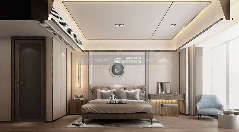 簡單,舒適,釋放身心的空間,區別于客餐廳棕色流金色調的營造,臥室以溫柔沉穩的白色調為主。銀色的線條精美氣質,營造輕奢感。純色的床具在光線照射下呈現如水般流動的絲滑感,奢華而不煩膩,貴氣而不張揚。簡潔的床頭背景墻一抹清新的藍色,成為了臥室中的亮點,溫潤彰顯,氣質有余。