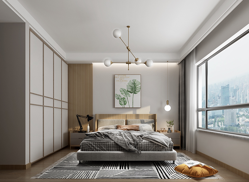 臥室延續(xù)整體空間白色和原木色的搭配,寬闊的衣柜帶來(lái)強(qiáng)大的收納功能,收進(jìn)生活的細(xì)碎,收進(jìn)一天的疲憊,騰出一片心靈的歸憩之地。條紋地毯增加藝術(shù)感,彰顯野性,灰色床具,是雅致,是沉靜,也是淡然。