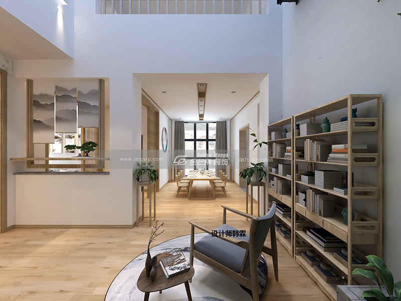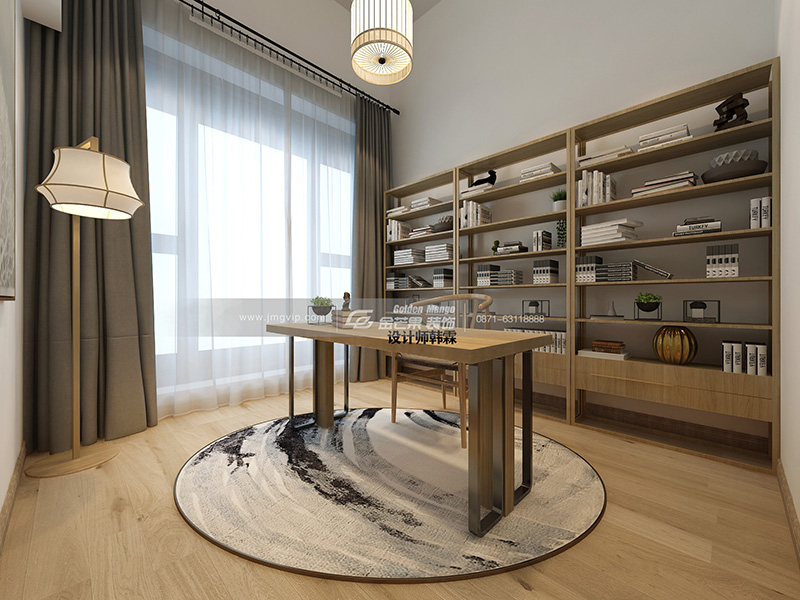 整體空間色彩仍是以淡色調為主,沒有過多的裝飾,為的是營造清雅的空間氛圍。地毯上的水墨圖案增加中國風的意境,主人可在此肆意潑墨揮毫。