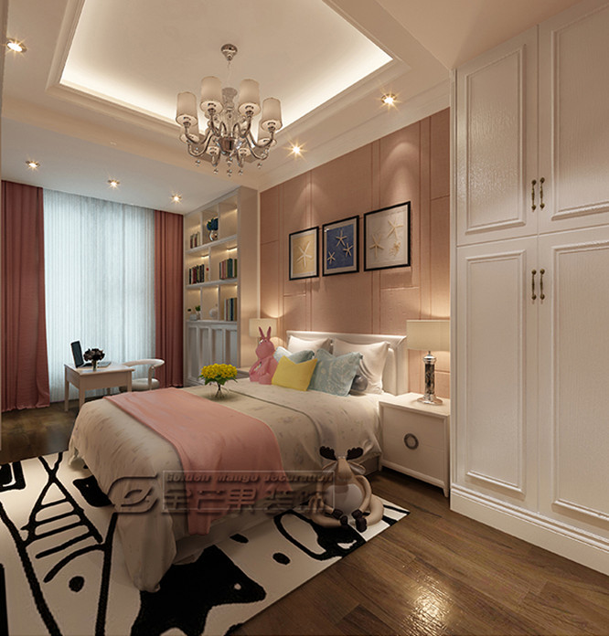 兒童房選用的是溫馨的白色和粉色,卡通的地毯和裝飾增加房間的趣味性。搭配一些歐式的燈具和櫥柜,又增加了房間的奢華感。