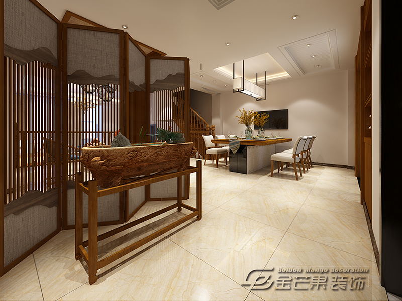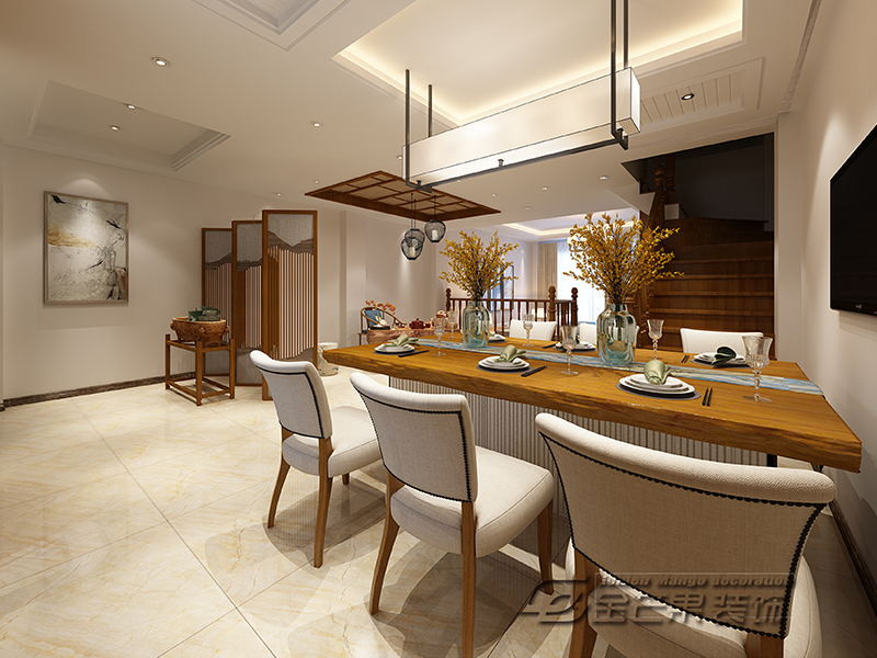這里再一次實現(xiàn)了中西碰撞,西式的餐吧椅、吊燈、酒柜,搭配中式的選材和瓷器等擺件,非常具有特色。