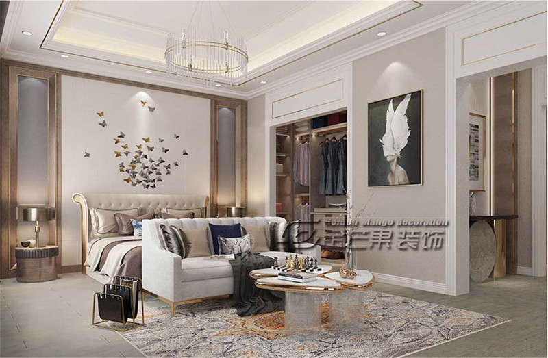 舒適雅致的就寢空間,溫柔的配色高級優雅,淺色系的搭配和舒適的床品、沙發帶來令人舒心的安全感。墻上的裝飾畫和客廳的裝飾畫是相呼應的。