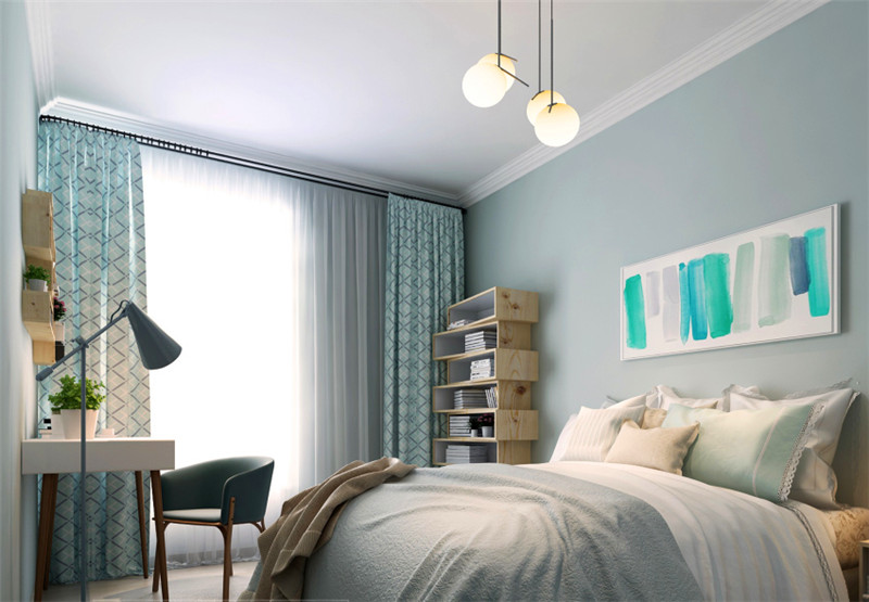 淺淺的藍(lán)綠色系,墻上的裝飾畫深化了整體顏色,點(diǎn)亮空間。帶有個(gè)性花紋的窗簾營(yíng)造文藝氣氛,讓整體空間不會(huì)過于單調(diào)。個(gè)性的吊燈增加時(shí)尚感,原木的書櫥豐富層次。