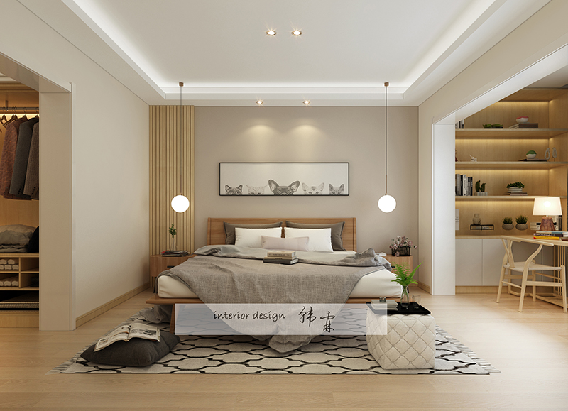 灰色的床具和柔和的淺色系搭配,整個空間的搭配大氣優雅。墻上的貓咪裝飾畫增加空間溫馨感。兩個球形的吊燈增加房間藝術感、臥室還設有辦公區域和衣帽間,功能性強。