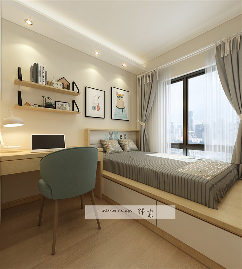柔黃色的色調、木質的地板讓整個空溫馨舒適,整潔的墻面搭配可愛的裝飾畫和展示架活潑、靚麗。溫柔的白色紗簾清新優雅。空間同時兼具臥室和辦公的功能,實用舒適。