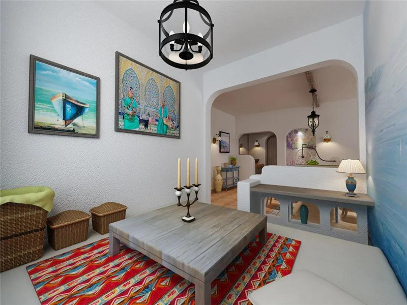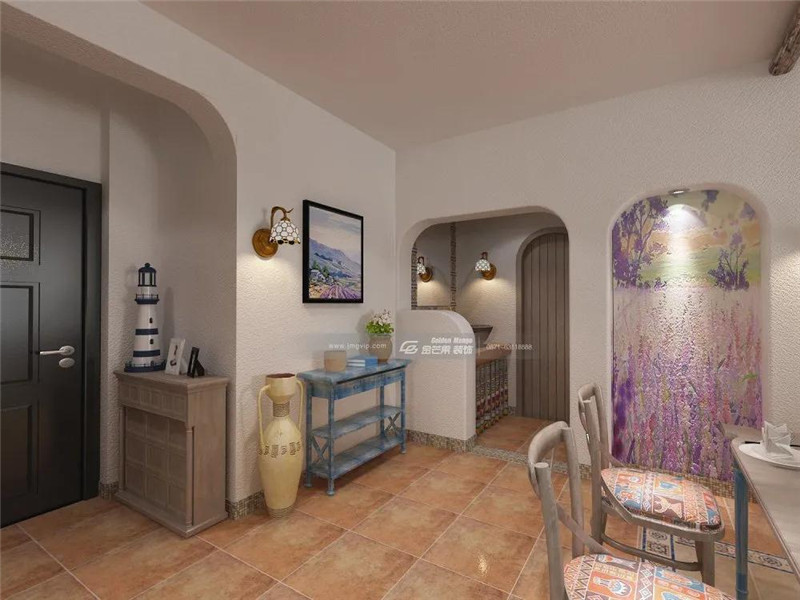 空間運用了很多拱門和半拱門的元素,這是在打造地中海風格中常用的經典元素。仿古地磚復古的顏色具有強烈的文藝色彩,薰衣草的油畫帶來法式浪漫,燈飾在畫上投下的光線,加深了視覺延伸感,視線的盡頭不知道會出現怎樣神秘又美好的地域。