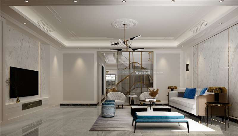 客廳和樓梯隔斷運用曲線、金色鐵藝等元素,增加奢華感,彰顯華貴和精致。正對面是寬大的落地窗,二者繁與簡的對比,體現空間感。