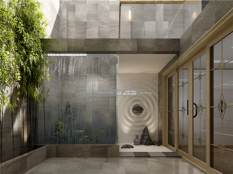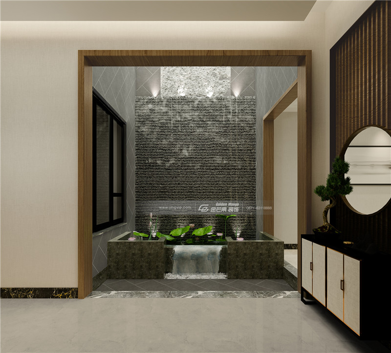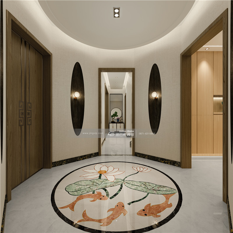 魚與花的圖案寓意富貴,和玄關處青松圖案相呼應。