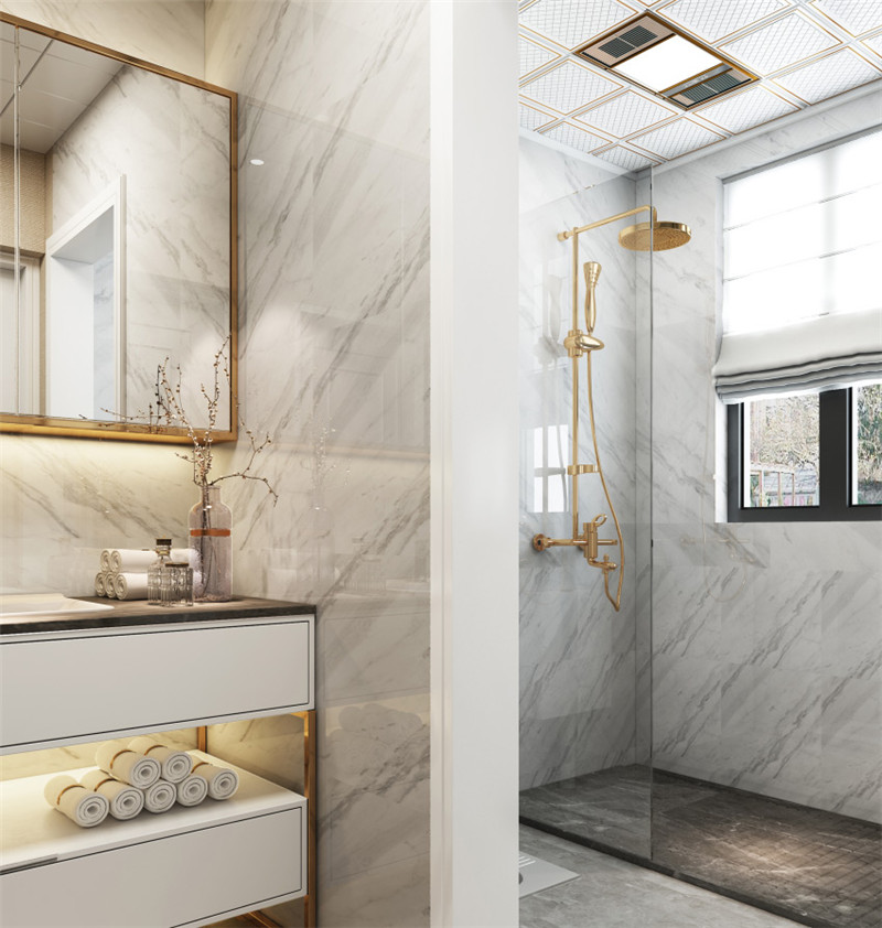 衛生間也精致感滿滿,細節處的精美設計奢而不膩,金色鐵藝營造滿滿的高級感,不放過任何一角,衛生間也可以是別出心裁的優雅空間。