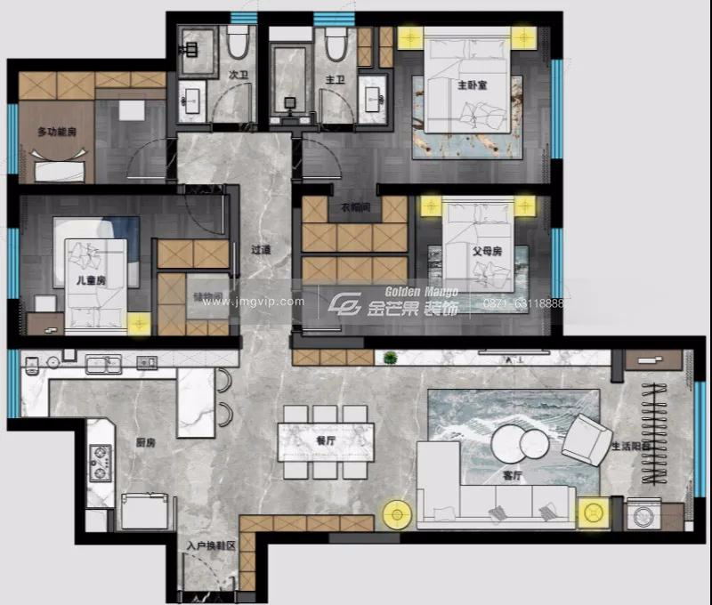 在客餐廳動區的設計上,設計師將整體空間連通,同時加入了許多特別的小設計。接下來,讓我們來看看房子客餐廳動區的設計效果圖。業主是一戶六口之家,除了主臥還需要一間兒童房和一間老人房,同時業主希望能有一間書房、一間儲物間以及一間帶衣帽間的主臥。于是設計師在原房基礎上進行改造,將兩間次臥的一部分分別改為儲物間和主臥衣帽間,以滿足業主需求,可謂是相當巧妙的設計。