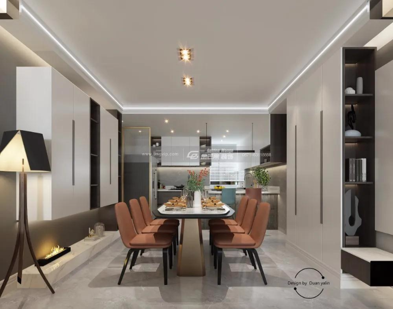 餐廳兩邊設計了一組立柜和一組吊柜,對稱又不會過于死板,增加儲物的同時也增強了整體空間的層次感。客餐廳吊頂結合燈槽走邊,減少直接照明,使整體光線更加柔和溫馨。