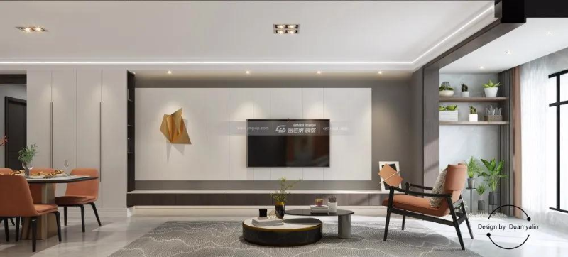 客廳同樣與陽臺連通,客餐廚的整體連通使整個空間更加通透明亮,令人心曠神怡。電視背景墻采用白灰拼接,增強設計感,下方一排電視吊柜實用美觀且方便打掃。橙黃色飾品和橙色椅子點綴空間,小茶幾同樣趣味美觀,與整體風格相呼應。