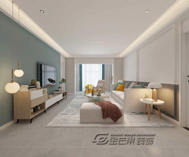 沙發(fā)背景墻以暖白色為主,凸起的方形石膏線條走邊讓普通墻體瞬間高級起來;暖白色沙發(fā)上井然有序的擺放著莫蘭迪綠,橙黃,皮粉等色彩明艷的抱枕作為點(diǎn)綴。吊頂邊緣嵌入式暗燈帶的設(shè)計使得客廳明亮通透,光線柔和不刺眼。