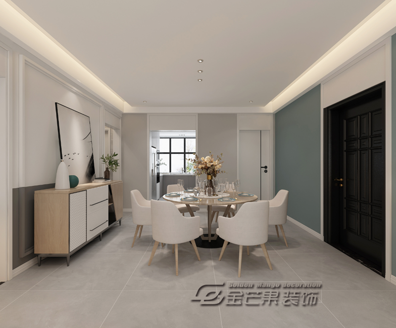 餐廳整體比較通透,原木色餐桌搭配暖白色的餐椅溫馨實(shí)用;簡約的原木色餐邊柜兼?zhèn)鋬ξ锕δ芎兔烙^性,暖白色門板用作點(diǎn)綴,與餐桌椅色調(diào)相融合;儲物柜對面墻體使用莫蘭迪綠色乳膠漆中和餐廳整體色調(diào)。
