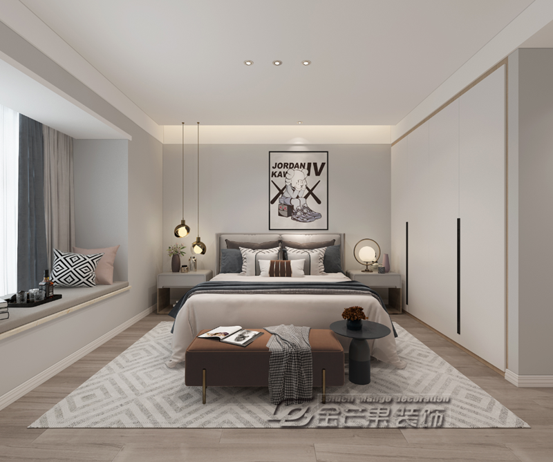 主臥的設(shè)計以灰白色為主要色調(diào),咖色的沙發(fā)和色系飽和度略高的的飾品做為點(diǎn)綴。兩側(cè)床頭柜設(shè)計感十足,簡約的飾品凸顯高級與質(zhì)感;采用間接照明,保證睡眠質(zhì)量,左側(cè)床頭柜垂立而下的吊燈讓臥室具有簡潔明快的層次感,與右側(cè)床頭柜上的臺燈呼應(yīng)出不對稱的美感。與主衛(wèi)之間做了一組雙面衣帽柜,很大程度上滿足了儲物需求。