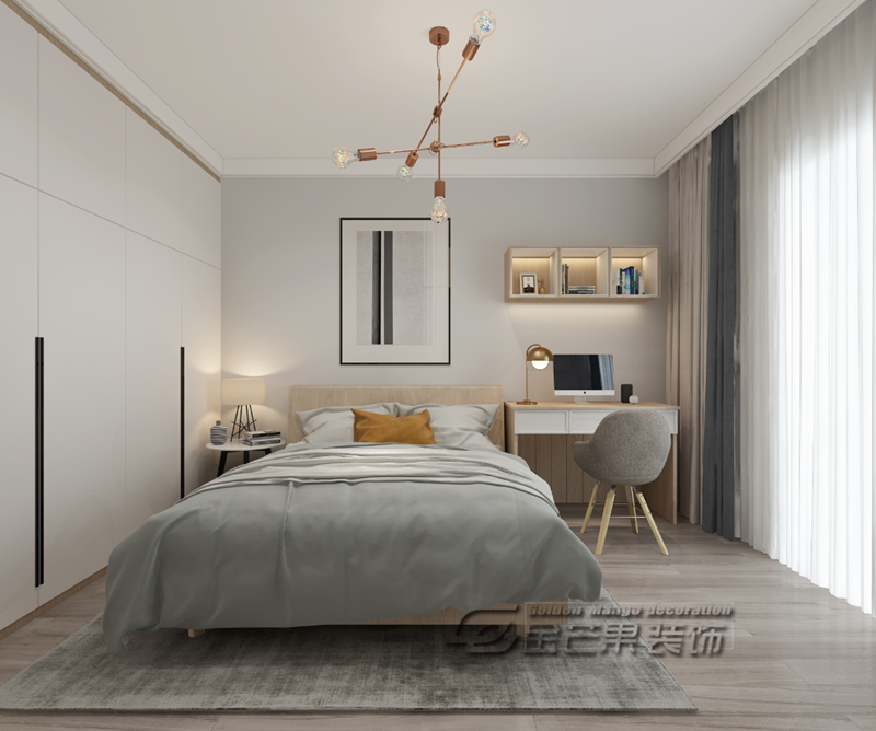 次臥設(shè)計也是以灰白色為主要色調(diào);古樸的原木色為輔色調(diào):原木色床架+原木色吊柜內(nèi)側(cè)嵌入式燈帶增加立體感+原木色書桌用白色抽屜做點(diǎn)綴,設(shè)計感很強(qiáng)的金屬色吊燈作為點(diǎn)綴,滿滿都是質(zhì)感,原木色和金屬色跟北歐風(fēng)真的很搭呢。