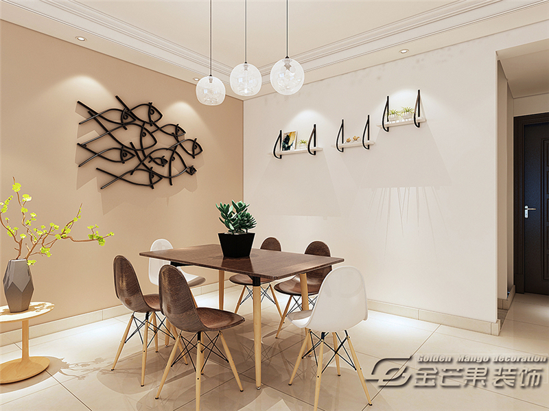 餐廳是以簡單的原木餐桌椅為主,簡單純粹。墻上的裝飾畫充滿趣味性,讓整體空間不會對于單調(diào)。綠植讓空間充滿生機。三個白色的吊燈有一些森系和空靈的韻味,讓業(yè)主享受浪漫又悠閑的森系生活。