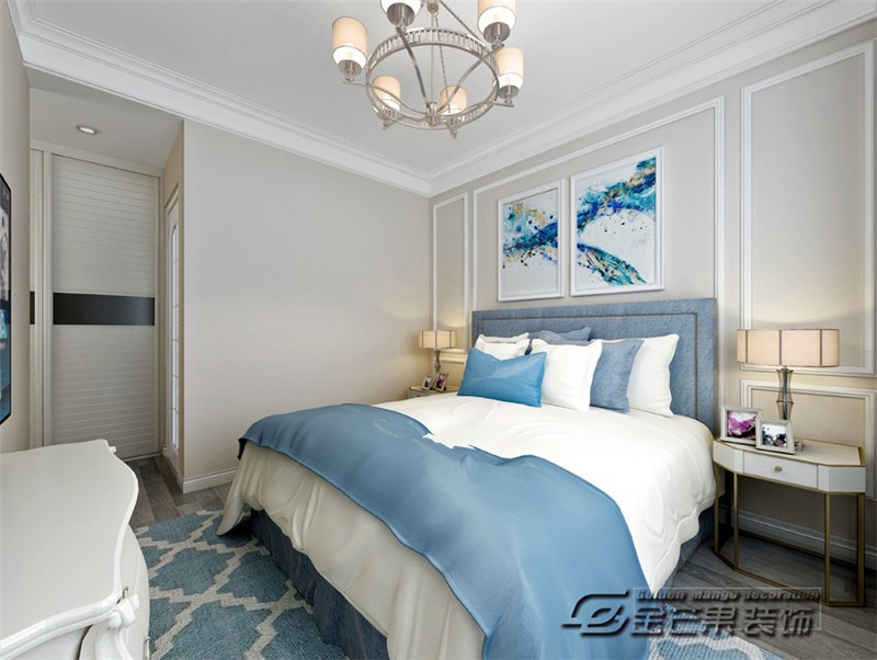 歐式的的窗簾搭配黑色的線條,精致又氣質(zhì),延續(xù)整體空間清新、優(yōu)雅的藍(lán)白色調(diào),營(yíng)造優(yōu)雅、舒適、溫馨的就寢空間。墻上的寫意裝飾畫為整體空間營(yíng)造藝術(shù)感。
