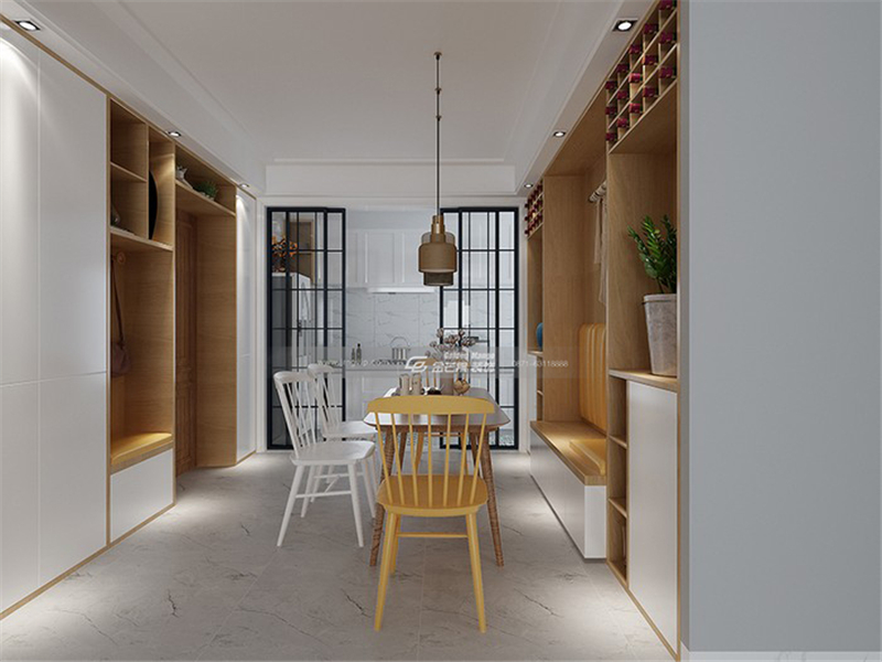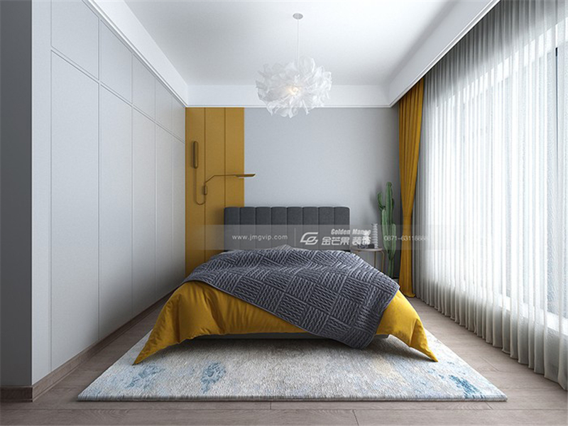 沉靜的藍色搭配幾抹黃色,沉靜雅致,穩重不失活潑。優雅的燈飾輕盈有氣質,中和了直線條帶來剛硬感。