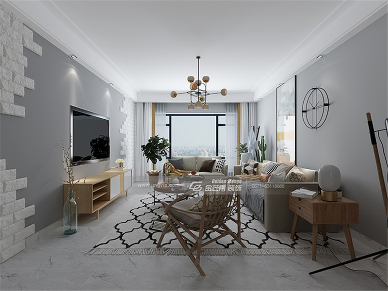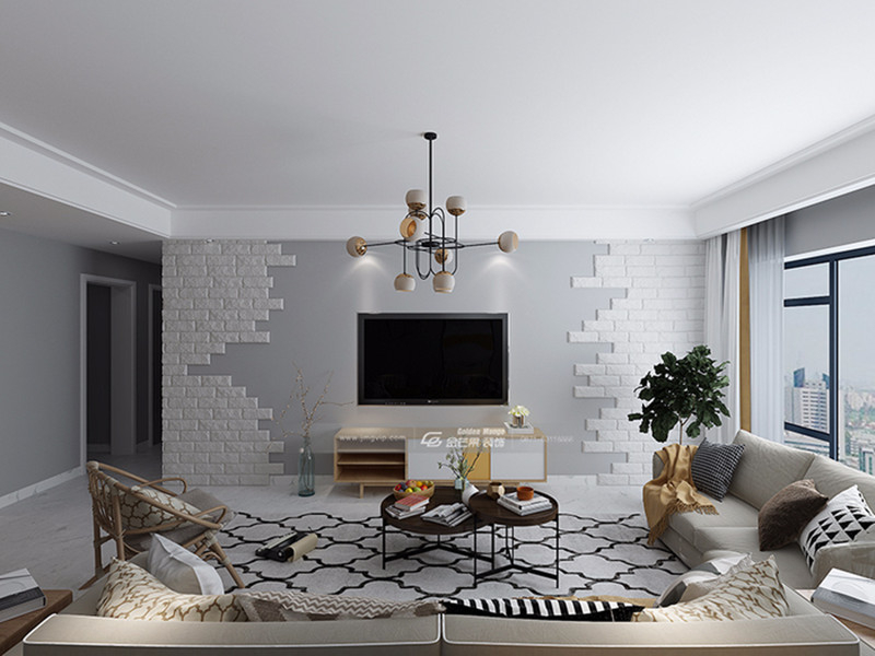 沉靜的顏色搭配防磚的電視背景墻,凸顯質樸的氣息,但因為選用的是白色的色調,高級感更顯。地毯花紋更加靈動,和沙發背景形成了一個呼應。