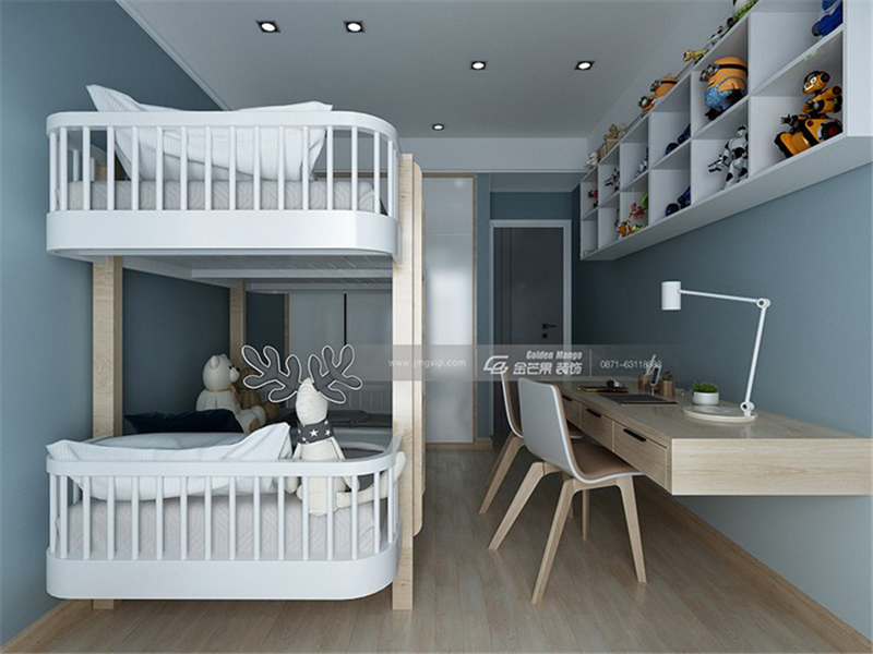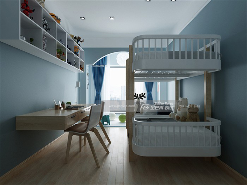 藍色的房間清新可愛,設置吊柜擺放生活用品和玩具,下面設置寬敞的書桌,滿足學習功能。白色上下床和藍色空間搭配,清新又單純。