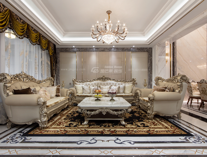 純粹而又傾注無限幻想,這華貴浪漫的初見,讓人忍不住去構思這座理想愛巢的主人畫像。歐式的沙發搭配銀色的雕花裝飾,體現的不僅是奢華,更是承載了許多浪漫與幻想。