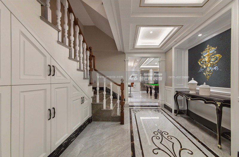一進門,地磚鋪花的儀式感延伸到室內,簡單、純凈的象牙白色調讓高級的生活更出色。入戶左手邊的儲物柜使進出之間更加便利簡潔,右手邊畫飾和地磚花紋打造空間呼應感。