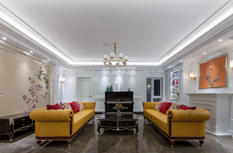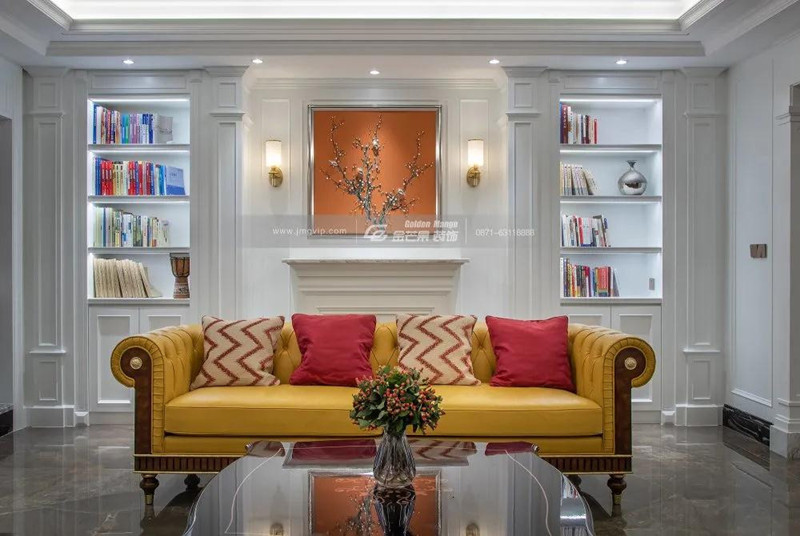 張揚明艷的黃色,點綴紅色抱枕,由點及面地提亮整體空間,都市時尚品味躍然于現。沙發背景墻兩邊書柜,用對稱營造空間的儀式感。