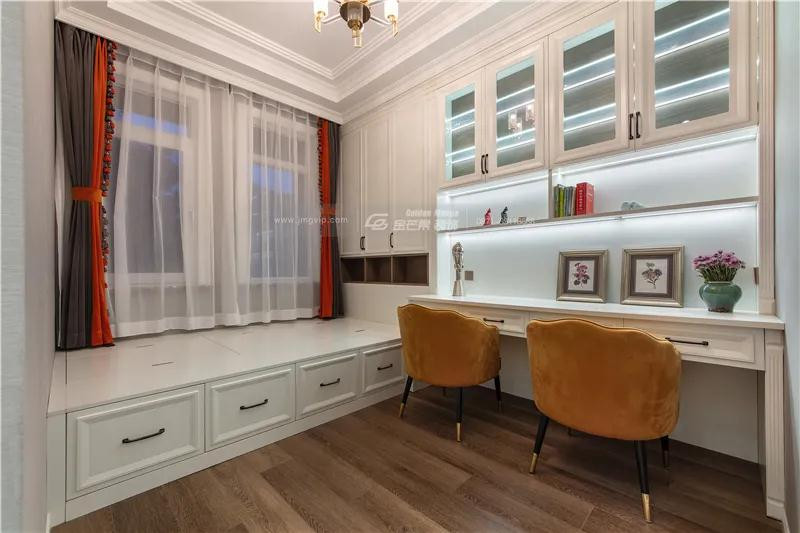 明亮的窗戶和雅致的窗簾,為空間注入蓬勃的朝氣,整體優雅的基調加上清新的藍色,讓閱讀思考空間變得靈動。