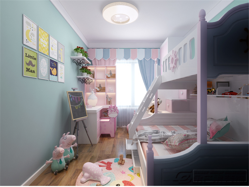 兒童房整體空間選用可愛的粉藍色和粉白色,給孩子一個色彩絢麗的童年,溫和不張揚。可愛的地毯和卡通玩具充滿童真。上下床的設(shè)計既實用又節(jié)省空間。