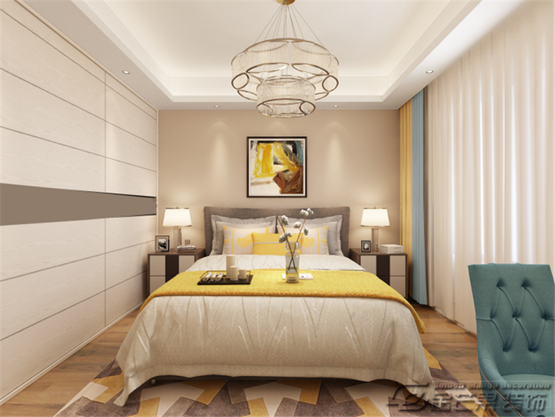 臥室是以溫暖的暖色系為主,非常溫馨,暖意融融,輕松舒適。有設(shè)計感的吊燈增加時尚感。白色窗簾溫柔又時尚,搭配黃、藍色,顏色明快、靈動、活潑。