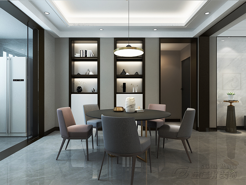 餐廳簡約吊燈設計,減少傳統吊燈對空間的壓抑和限制,餐桌椅與周邊一致的色系,讓區域更為統一。其中餐桌使用魚肚白石材與鎏金色幾何桌腿,蓋上黑色玻臺,碰撞出強烈的設計感。