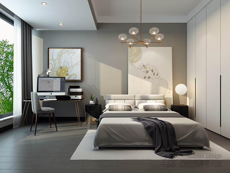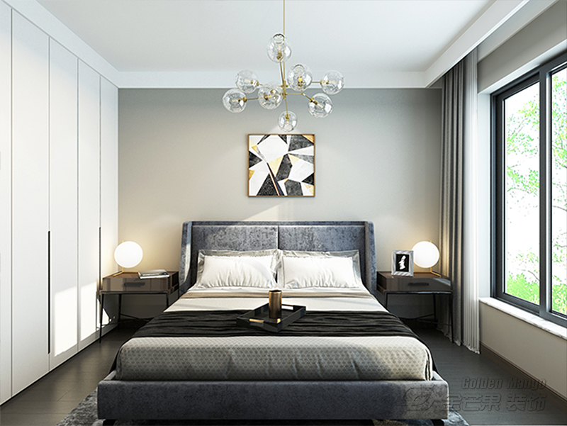 霧霾灰色的墻面和床具、黑與金的撞色床頭柜、墻面上一大一小暖白色的裝飾畫、鎏金色的泡泡吊燈,這些看似簡單的搭配,細節的處理卻頗有設計感。