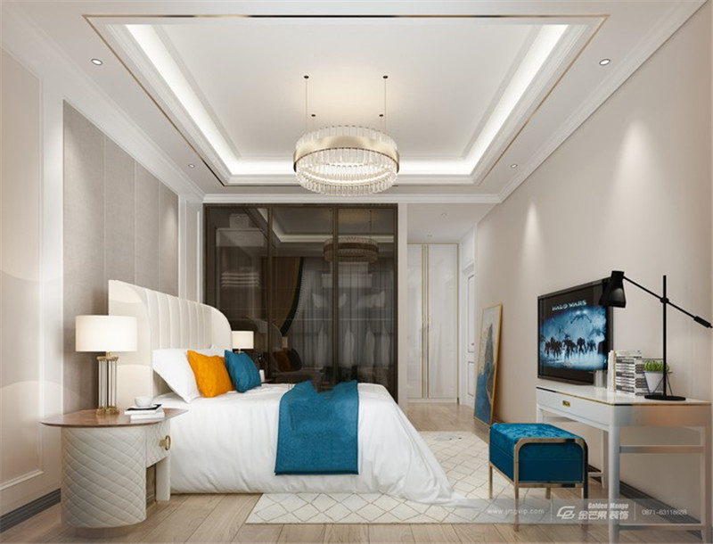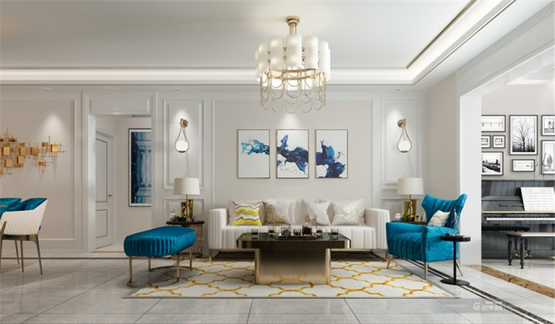 地毯運用金色和白色元素搭配,彰顯華貴感。墻上的裝飾畫營造藝術氛圍,藍色也和空間相呼應。