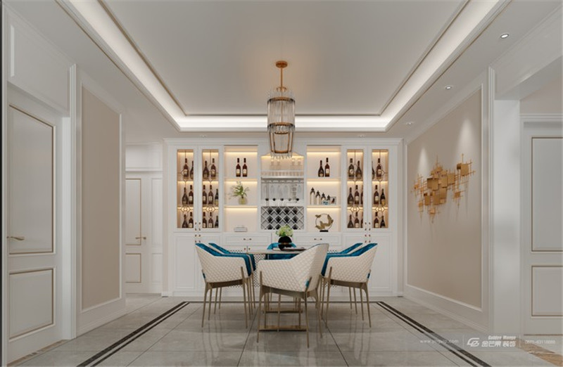 藍色的餐桌椅和客廳相呼應,歐式餐邊柜盛放紅酒提升家居品質。精致不隨意的用餐空間。