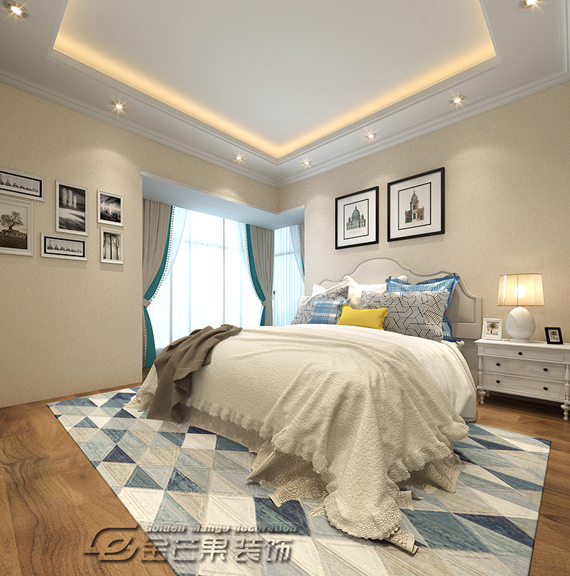 歐式的床具營造優雅、浪漫的歐式情調,簡潔的裝飾和木地板增加溫馨感。裝飾畫增加文藝感,藍色的地毯豐富空間顏色。