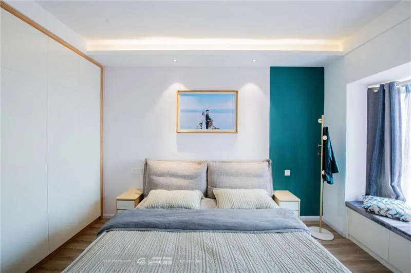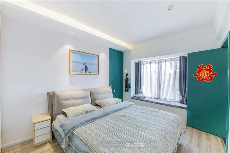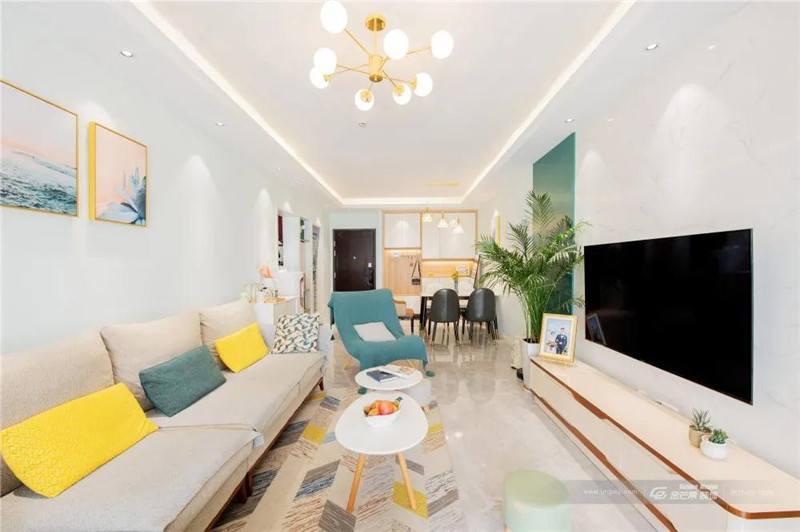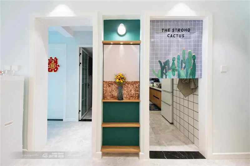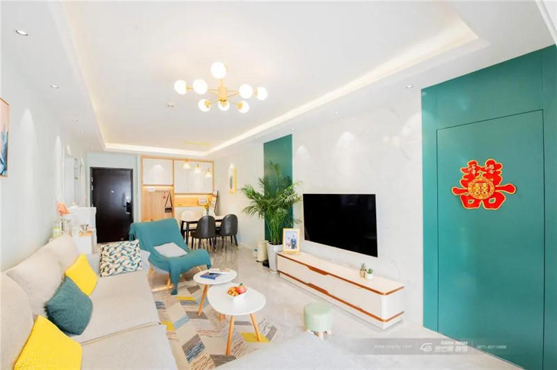 純凈白色墻壁融入干凈綠色的元素,讓整體空間不會顯得單調,緩解視覺疲勞。電視背景墻旁邊潛藏的臥室暗門,別有洞天。