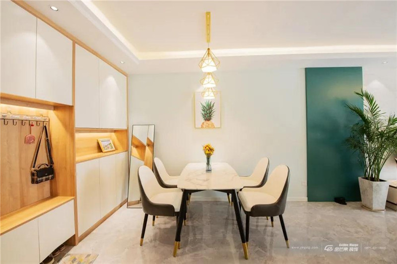 入門玄關柜連著卡座,換鞋、放置包包、鑰匙等小物件,進出門更加便利。收拾好生活的瑣碎,才能騰出手牽著親愛的你。