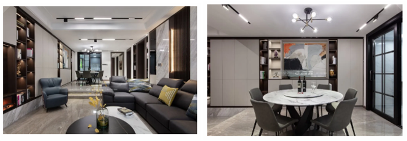 大理石臺面的餐桌和柜體形成顏色上的呼應,深色的餐座椅在淺色系的空間里形成明度上的呼應。頂面可移動的軌道燈可以將光源隨時變換,體驗感更佳。