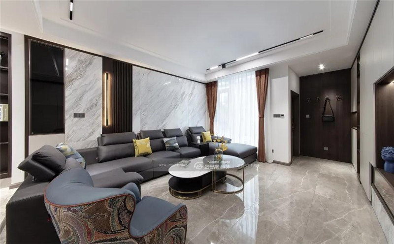 客廳寬大的落地窗正對外面的小花園,在室內就可欣賞窗外的美景。相對的電視背景墻和沙發背景墻,木材和石材的碰撞,一剛一柔之間,讓空間更加豐富。