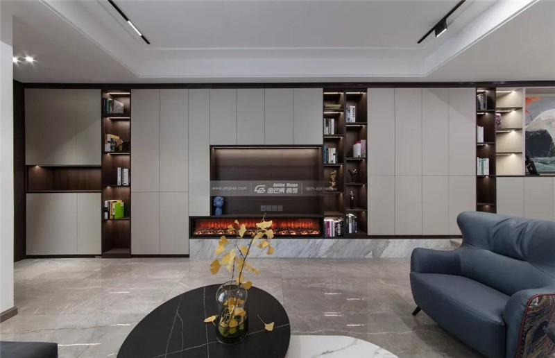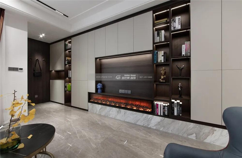 電視背景墻一整面柜體做到頂,溫厚的木材溫暖感滿滿,中間擺放一些小物件,精制又好看。電視柜下面設置電動的壁爐,冬天的時候和家人呆在家里,敷一毯子,選一場喜歡的電影,感受靜謐的美好。