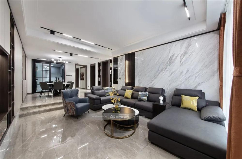 吊頂側邊細節處理,與柜子的鋼條和大理石的分縫產生聯系,整體感和空間呼應感更佳。