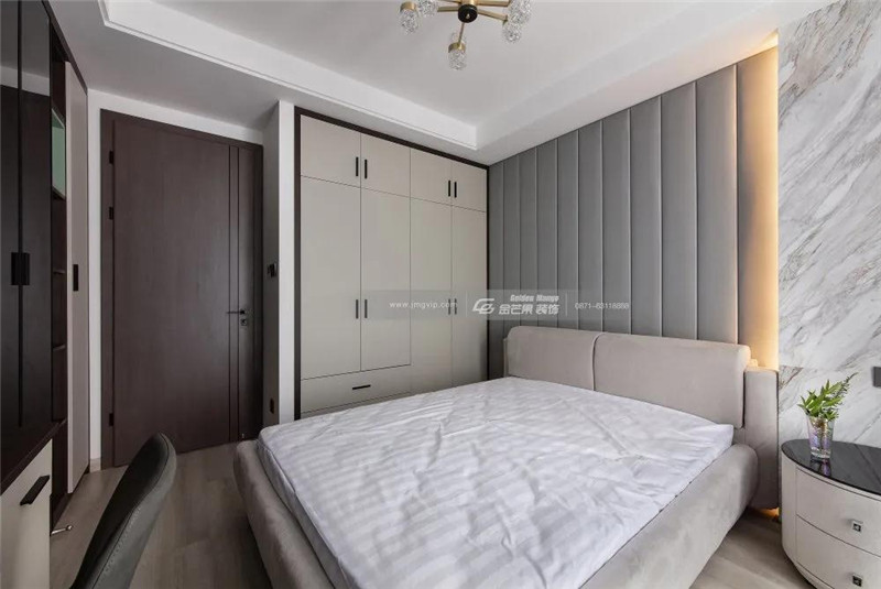 床頭背景墻采用硬包加石材的處理,在輔助光源的加持下,時尚、精致感俱佳。木質柜體加上灰玻,又酷又時尚。一邊是孩子做作業的區域,一邊擺放一些小擺件,好看、實用。