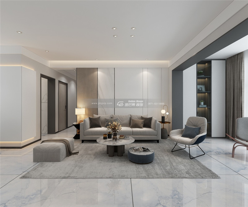 電視背景墻采用石材的材質,簡雅的紋路顯而不露,藝術感的展現。兩邊的鏤空豐富空間層次,讓空間不會顯得單調。簡約的小幾讓空間更有韻味,優雅氣質。