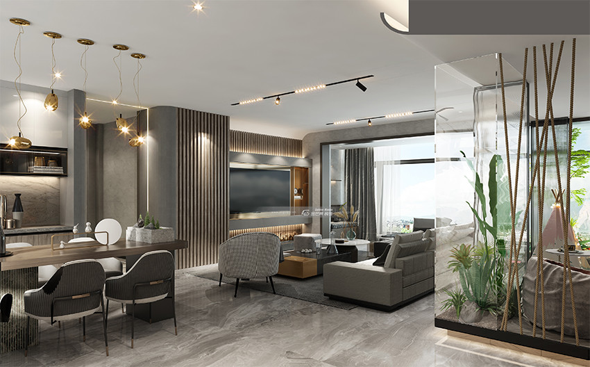 隔斷隔而不斷,加入一些簡單的綠植,營造一種大自然的通透感,與室外風景結合,一幅美好的圖景。