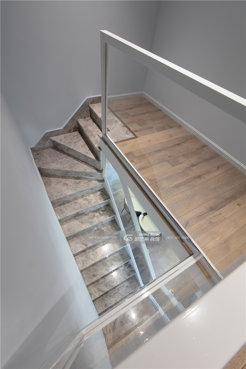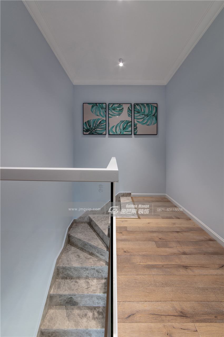 玻璃扶手不會讓空間顯得狹小,增加靈動性。木地板和簡約的藍色墻體的結合,是不是溫馨感滿滿呢?這是獨屬于私密空間的輕松、自由感。裝飾畫的加入增加了清新、可愛的味道。
